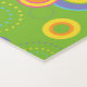 El diseño de fondo luminoso y colorido presenta círculos de múltiples anillos de diferentes tamaños y colores sobre el fondo verde de la hierba.