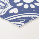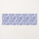 Estera de yoga de estilo bohemio con estampado azul y blanco. La alfombra presenta un patrón boho y un Peacock decorativo estilizado.