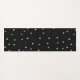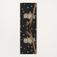 Esta alfombra de yoga es negra con estrellas blancas y dos lechuzas marrones de bonito con ojos dorados sentados sobre ramas de árboles usando collares azules.