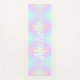 Una alfombra de yoga con fondo azul y rosa oscuro holográfico arco iris y personalizada con tu nombre, o tu cita favorita de yoga.