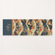 This retro look serving yoga mat features a Japanese style print -- similar to patterns from kimonos -- with white, teal, tan, and orange on dark teal-- almost black. Swirls of stylized clouds interplay with beautiful cheery flowers, mixed in with subtle stripes and other geometrical elements. Your initial monogram appears in gold text on a coordinated color block of dark blue teal, bordered by orange, at the bottom of the mat.