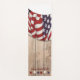 Un lado de este empavesado patriótico de los E.E.U.U. de las características de la estera de la yoga en rayas rojas y blancas más un campo azul con las estrellas blancas cubrió sobre un fondo de madera del listón. La parte inferior ofrece una fila de estrellas rojas, blancas, y azules. Complete el campo de la plantilla de la personalización de su información, quítelo o haga clic el personalizar para seleccionar un estilo de la tipografía, tamaño, y coloréele tienen gusto.