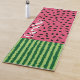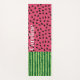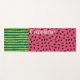 Melón de yoga personalizado rosa y verde - ilustracion divertido de una sandía es personalizado con tu nombre yendo por un lado. La parte inferior es de dos tonificos de sandía verde y la parte superior es rosa caliente con semillas negras. El reverso de la alfombra de yoga es un patrón de hileras de cuñas de sandía sobre un fondo rosado.