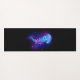 Gran medusa azul, de dibujo artístico, brillante y brillante, con largos tentáculos sobre fondo negro con bioluminiscencia violeta. Luminosas medusas.