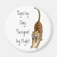 Diseño original de arte fino de un tigre de Bengala estirándose en un imán redondo de personalizable del diseñador Carolyn McFann de Two Purring Cats Studio para fanáticos de gatos grandes.