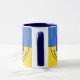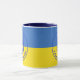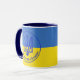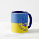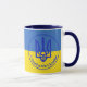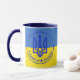 Muestra tu apoyo a Ucrania con esta inspiradora taza. El diseño presenta el tridente, el símbolo nacional de Ucrania. El texto azul incluye las palabras "Yo apoyo a Ucrania".