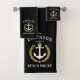 Personalice su casa de vacaciones con un elegante juego de toallas de baño de temática náutica que muestre su nombre familiar, casa de playa, cabaña u otro texto deseado. Este diseño personalizado presenta un ancla de barco vintage, hojas de laurel de estilo dorado con emblema estrella sobre un fondo negro real. La parte posterior del juego de toallas es blanca y se puede cambiar fácilmente el color primario del lado delantero para que coincida con la decoración o temática actual.