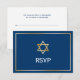 Una carta clásica de Bar Mitzvah RSVP con un diseño de la estrella de David en oro y azul oscuro. Los diseños son ilustraciones/gráficos impresos planos - NO RELIEVE METALIZADO DORADO REAL.