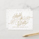 Pequeñas estrellas doradas brillantes y relucientes brillan en nubes de confeti alrededor del borde de esta hermosa tarjeta postal dorada y blanca de "Save the Date", con un efecto de brillo dorado que dice "Save the Date". Elegante, chic y encantador todo a la vez. Arte original de Colleen Michele. Tenga en cuenta que no hay un efecto de brillo dorado real o de hoja de oro en las estrellas y la escritura; no se utilizará brillo real, hoja de oro ni tinta metálica en esta invitación.