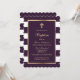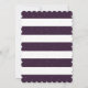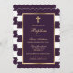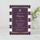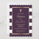 Elegante invitación al bautismo de rayas moradas y blancas que exhibe una cruz de oro, un marco y pequeñas estrellas.
