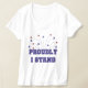 Estrellas de rojo y azul con texto de azul que dice Orgulloso I Stand, para mostrar su apoyo por defender el himno nacional.