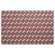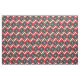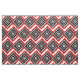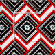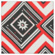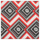 Se trata de un moderno diseño de tela contemporánea en rojo, blanco y negro, en un patrón geométrico abstracto de rectángulos, cuadrados, líneas y estrellas rodeados por un motivo de chevron.