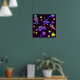 Una bonita escena espacial llena de estrellas amarillas, planetas coloridos y personajes adorables. Un extraterrestre verde con zapatos de cohete, una flor alienígena en una olla de flores, un cohetes futurista retro con una dama y su mascota gato montando en él, y un platillo volador con un extraterrestre feliz que le saca los ojos. Con MLO, la firma de los artistas, escondida bajo los planetas.