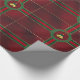 Campanas de oro colgadas en el centro de una corona de hojas oscuras y joyas rojas para bayas, interseccionadas por cintas de rojo y verde con estrellas de oro. Como un regalo de Navidad envuelto en rojo oscuro y atado con cintas de rayas brillantes.