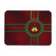 Campanas de oro colgadas en el centro de una corona de hojas oscuras y joyas rojas para bayas, interseccionadas por cintas de rojo y verde con estrellas de oro. Como un regalo de Navidad envuelto en rojo oscuro y atado con cintas de rayas brillantes.