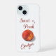 Muestra tu amor por el verano con este estuche de teléfono temático de melocotón. Este diseño de melocotón dulce y aterciopelado presenta tonos cálidos y luminosos de color rubor, escarlata, ámbar, coral y lila. Personalice cambiando o eliminando el texto. Creé este patrón a partir de una imagen de mi pintura acrílica original.