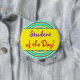 Este caprichoso y positivo diseño de botones muestra el mensaje "¡Estudiante del día!". Un botón como este podría ser usado para reconocer a un estudiante que lo ha hecho bien. [~Z0000317]