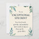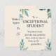 Estudiante Excepcional es una tarjeta de agradecimiento sincero diseñada para educadores que desean reconocer y celebrar el logro estudiantil. Con un suave diseño de acuarela botánica con hojas verdes y sutiles motas doradas sobre un fondo beige cálido, esta tarjeta transmite un mensaje de aliento y positividad. Su redacción universal la hace adecuada para estudiantes de todas las edades y orígenes. Ya sea utilizada en aulas, ceremonias de graduación o notas personales de reconocimiento, esta elegante tarjeta ayuda a los maestros a expresar gratitud e inspirar un crecimiento continuo.