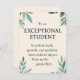 Exceptional Student es una sincera tarjeta de apreciación diseñada para los educadores que quieren reconocer y celebrar los logros de los estudiantes. Con un suave diseño de acuarela botánica con hojas verdes y sutiles especkles de oro sobre un cálido fondo beige, esta tarjeta transmite un mensaje de aliento y positividad. Su redacción universal lo hace apto para estudiantes de todas las edades y orígenes. Ya sea que se utilice en aulas, ceremonias de graduación o notas personales de reconocimiento, esta elegante tarjeta ayuda a los profesores a expresar gratitud e inspirar un crecimiento continuo.