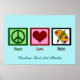 Poster de Peace Love Paint con un signo de paz de la bonito, corazón rojo y una bonita paleta de arte. Una bonita huella turquesa para colgarse en una sala de juegos para niños o en un estudio para artistas. Personalizar con su propio texto.