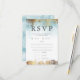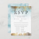 Tarjeta RSVP de boda moderna y elegante, con pintura de acuarela azul abstracta con pincelada dorada. Esta tarjeta de respuesta también enumera la selección de entrada de los invitados.