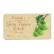 Un ilustracion de un montón de tomates verdes con hojas, en un fondo beige con texto de color rojizo, hecho de una pintura digital y una foto. La etiqueta está preparada para el enlatado o embotellado de recetas caseras, chutneys, ketchup y conservas. Puede dejar el espacio de fecha para escribir o cambiar a la fecha en que se hizo el producto.