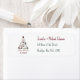 A la izquierda de la dirección de retorno impresa, hay un árbol de Navidad hecho de juguetes vintage: muñecas vestidas de rojo, verde o blanco, caballos de juguete, osos de peluche, monos, elefantes y payasos y también velas rojas. En la base, hay tipografía: el mensaje "Feliz Navidad" escrito en un elegante guión caligráfico rojo y bajo él, el nombre en letras rojas. Los juguetes vintage son de muñecas de papel con temática Navidad de Sheila Young, "Presenting Lettie's Grandfather, quien trae regalos de Navidad a Lettie", de "The Lettie Lane Paper Family", una serie de muñecas de papel publicada entre 1908 y 1915 en "The Ladies Home Journal", ahora de dominio público.