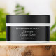 un baño de estilo básico y una etiqueta de producto de cuidado corporal con fondo negro y texto blanco.