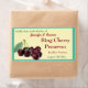 En la esquina inferior izquierda de la etiqueta, un conjunto de cerezas con tallo y hojas se esconde un fondo de amarillo pálido, todo ello rodeado por un borde y un fondo de verde turquesa moderado, lo que hace de esta etiqueta perfecta para usar en las jarras de mermelada de cerezo casera o de mermeladas. El texto está en forma de plantilla para que pueda cambiarlo a lo que desee.
