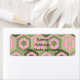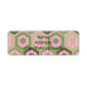 Estas etiquetas de dirección de retorno tienen un diseño geométrico de hexágonos en cuatro tonalidades de verde sobre un campo de rayas rosas en dos tonos.