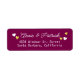 Tu dirección personal personalizada de una manera fácil... etiqueta de color de vino con dos líneas de texto alineadas por el centro, y nombres de novios y novios escritos en un estilo de letra de guión elegante con la imagen de pequeños corazones de amor blancos y dorados.