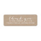 Boda de script simple Gracias Devolver la etiqueta de dirección. Diseño de Elke Clarke© para MonogramGallery impreso por Zazzle. Envíe sus tarjetas de agradecimiento a su boda a sus amigos y familia usando esta etiqueta bonita y simple con las palabras "gracias" escritas en una sobreimpresión de texto de escritura tipográfica a mano blanca. Puedes personalizar con tus nombres casados y fecha de boda. Efecto fotográfico impreso del fondo de papel beige kraft. Hay otros colores disponibles.
