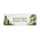 Los árboles de Evergreen enmarcan la información de su dirección de retorno; con una bandada de aves volando sobre sus cabezas. Relajando la escena de la naturaleza con un texto en negrita y verde sobre el bosque.