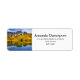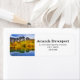Etiquetas de direcciones con una hermosa fotografía de país. Montañas de piedra con un bosque otoñal de colores vivos. Un lago tranquilo refleja las montañas, los árboles y las hierbas.