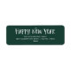 Estas coloridas etiquetas de direcciones de retorno dicen "Feliz Año Nuevo" en un fondo verde forestal, con una tipografía moderna y caprichosa de color blanco.