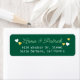 Tu dirección personal personalizada de una manera fácil... etiqueta de color verde oscuro con dos líneas de texto alineadas por el centro, y nombres de novios y novios escritos en un estilo de letra de guión elegante con la imagen de corazones de amor pequeños blancos y dorados.