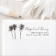Un conjunto único de etiquetas con la temática de la palmera, con la dirección y el nombre de la pareja en forma de escritura cursiva.
