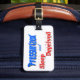 La parte posterior de las características del este diseño del personalizable una silueta negra de un aeroplano en un fondo blanco. ¡Añada su nombre para personalizar esta etiqueta caprichosa del equipaje! El frente de las características del este diseño de la diversión rojas y del texto azul que lee: "Presurizado y sueño privado". ¡Esta etiqueta única del equipaje hace un gran regalo para ese asistente o piloto de vuelo en su vida!