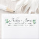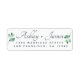 Moda, moderna etiqueta de dirección de retorno de boda blanco y negro con sus nombres en un elegante guión escrito a mano sin negro y un elegante toque de follaje verde. Simplemente agregue sus nombres y dirección. Diseñado exclusivamente para usted por Happy Dolphin Studio. Si necesita ayuda o productos coincidentes, póngase en contacto con nosotros en happydolphinstudio@outlook.com. ¡Estamos encantados de ayudarle a hacer de su boda el día más hermoso!