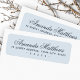 Etiquetas de dirección de devolución elegantes en azul polvoriento con su nombre en una fuente caligráfica elegante y la dirección debajo