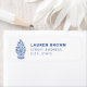 Estas etiquetas de dirección devueltas incluyen un frasco de jengibre azul y blanco. Su nombre y dirección están en una fuente azul, san serif sobre un fondo blanco brillante.