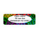 Estas etiquetas de dirección devueltas tienen un diseño de Historia Negra de grandes círculos formados de formas de gotas de lluvia y círculos en rojo, amarillo, púrpura, verde y turquesa.