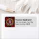 Insignia de cresta del clan MacQueen rodeada por una correa y hebilla sobre fondo tartán. Campos de texto personalizados para nombre y dirección.