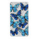 Composición vertical de mariposas morfo realistas, azules y blancas sobre fondo texturado gris. Mariposa morfo azul.