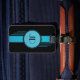 Etiqueta del equipaje del art déco. Las iniciales se enmarcan en un círculo azul con la frontera doble negra y las rayas azules