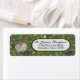 Diseño vintage con fondo de frambuesa verde vibrante. La placa de dirección oval es blanca con el borde verde del jardín inglés. El conejo blanco se come las bayas en un jardín inglés.