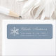 Una elegante etiqueta de dirección de regreso azul polvoriento y plateado, recomendada para la tarjeta de saludo de las fiestas de invierno. Tiene un copo de nieve de lámina plateada falsa en la izquierda y texto gris claro en la derecha. El nombre está escrito en una caligrafía elegante, la dirección en letras mayúsculas más pequeñas. Se puede utilizar para una tarjeta de Navidad o Año Nuevo. El fondo es azul polvoriento.