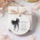 Elegantes etiquetas de agradecimiento para despedida de soltera que presentan un lazo coquette en acuarela negra, "con amor y gracias" en una tipografía chic, y el nombre de la novia y la fecha de la celebración en letras modernas sencillas.