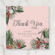 Estas elegantes etiquetas de agradecimiento para ducha de novia presentan ilustraciones temáticas de flamencos tropicales dibujadas a mano en tinta negra, que muestran flamencos rosados, flores de hibisco y jazmín, una piña y hojas tropicales. La parte posterior presenta un hermoso patrón con estos elementos más una bebida tropical.