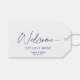 Añade un toque refinado a tus regalos de boda con esta etiqueta de doble cara. El frente presenta un fondo blanco limpio con la palabra "BIENVENIDA" en un guión elegante, mientras que la parte posterior muestra delicados florales de color azul polvoriento. Perfecto para cajas de invitados, bodas de destino y favores personalizados.
